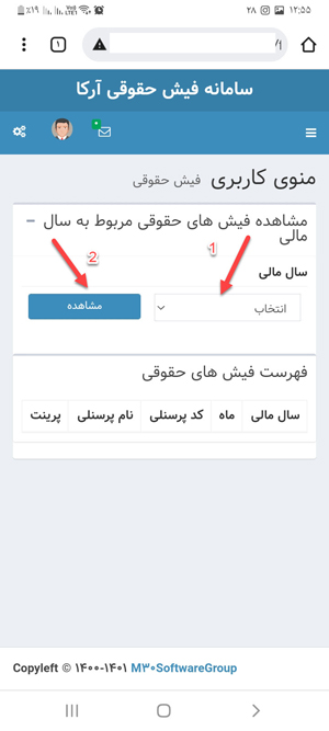 3- در اين بخش بعد از انتخاب سال مالي و کليک روي رکمه مشاهده فيش هاي صادر شده براي ما به نمايش در مي آيد و با انتخاب دکمه پرينت وارد صفحه پرينت فيش حقوقي ميشويد