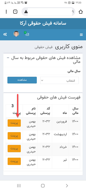 3- در اين بخش بعد از انتخاب سال مالي و کليک روي رکمه مشاهده فيش هاي صادر شده براي ما به نمايش در مي آيد و با انتخاب دکمه پرينت وارد صفحه پرينت فيش حقوقي ميشويد